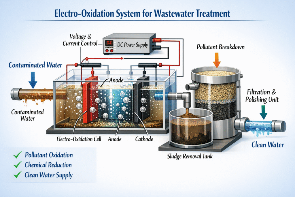 An EO system comprises electrochemical reactors, power regulation units, hydraulic control components, and monitoring instrumentation. System parameters such as current density, electrode surface area, and hydraulic retention time are optimized during design to match specific wastewater profiles.